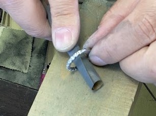 ルーペで全体の状態確認。深い傷はないので全体をペーパーやすりで均等に磨きます。デザインの谷間の部分にもしっかりペーパーを。この下地作りでプラチナのツヤが決まると言ってもよい大切な作業です。
