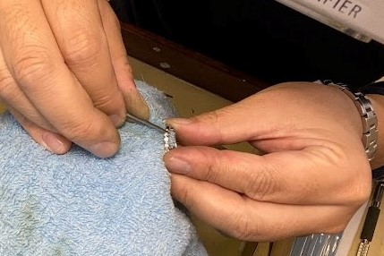 磨き棒で、表面を抑えつけながら整えます。アスファルトにロードローラーをかけるイメージです。棒の種類を使い分けながらツヤをだしていきます。ダイヤを留める細かい爪も1本ずつ手を抜きません。