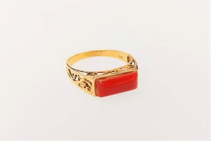 サンゴのツルツルした表面とツヤが復活しています。一緒にゴールドの指輪部分もクリーニングしました。