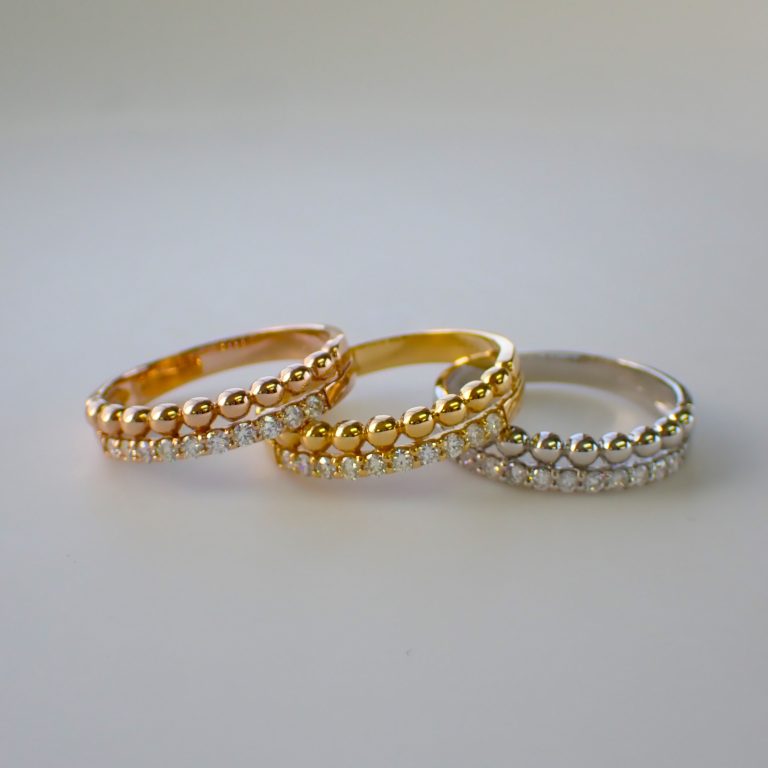 赤みかかった柔らかい色合いのゴールド。イエローゴールドよりも華やかさは控えめ。素肌に馴染む色合いはダイヤの輝きを引き立てます。